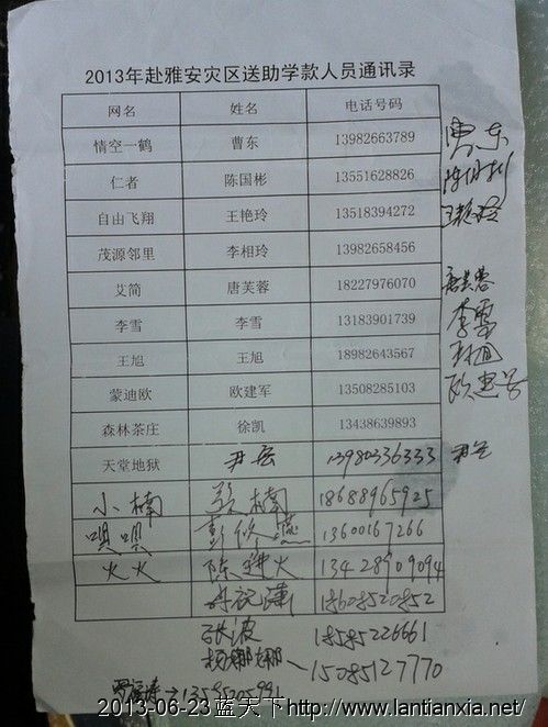 经过我们全体义工的积极参与,我们顶着风雨,终于提前完成我们的助学任务。在完成任务后的下午,在封路的情况下,我们想方设法说服交警,怀着紧张的心情,冒着生命危险,快速通过飞石路段,从宝兴县冲出重围,终于安全抵达雅安县城。找到住地,我们又急着做资料、写总结,存档,一切以奉献爱心、抓紧时间,讲究效率,节约不必要的开支为宗旨。