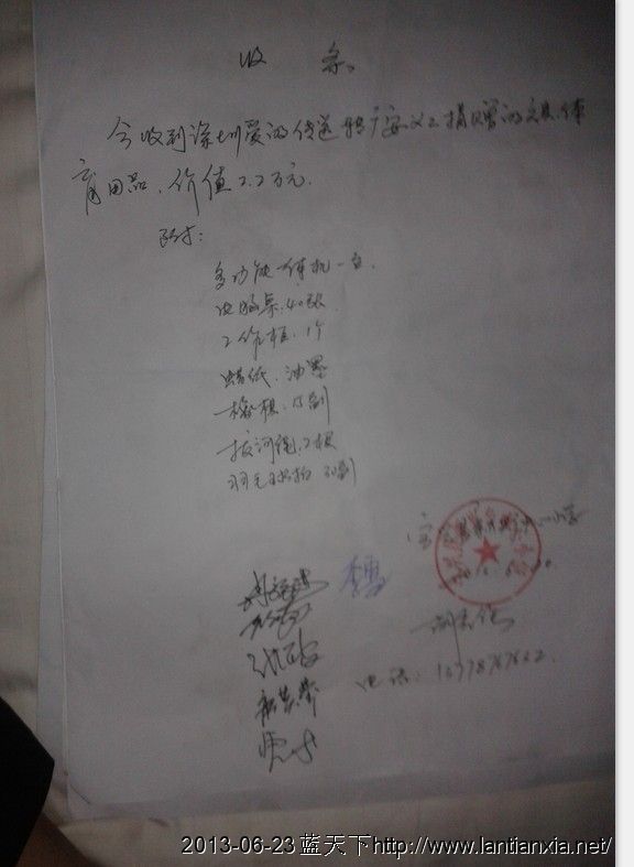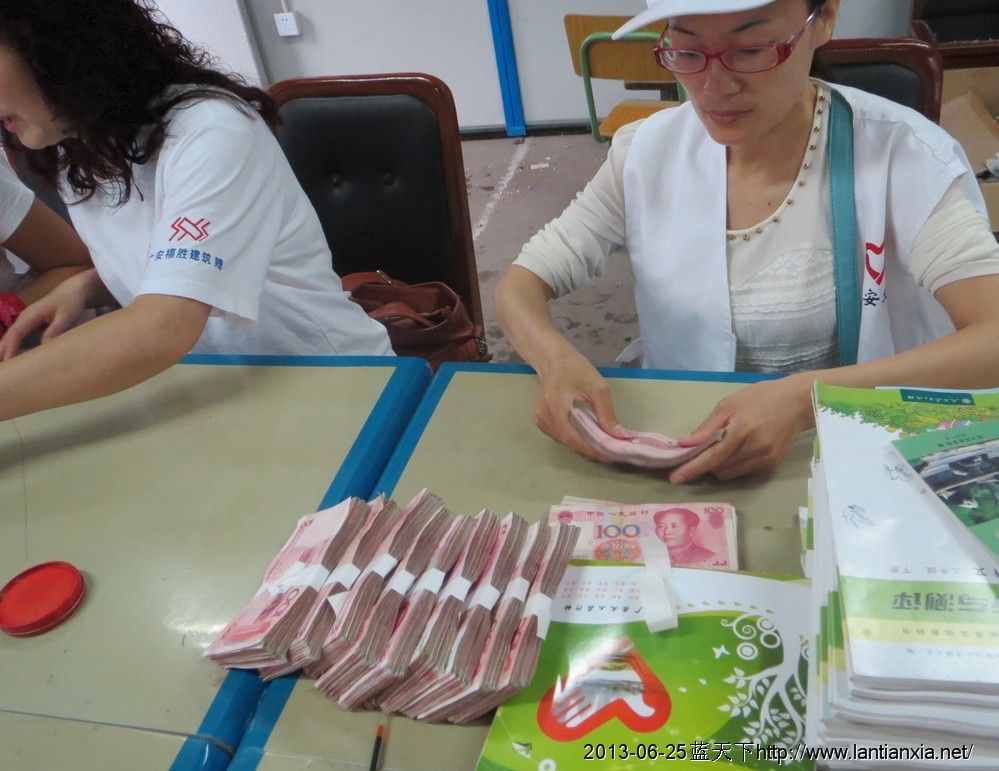 我们此次活动捐赠助学款总数11万元,体育器材和学习用品2.2万元,,百丽捐赠的衣服5万,共18.2万元,把绝大部分的募捐款亲自交到了灾区贫困生手中,对各界捐款的爱心人士有了一个无愧于心的交代。