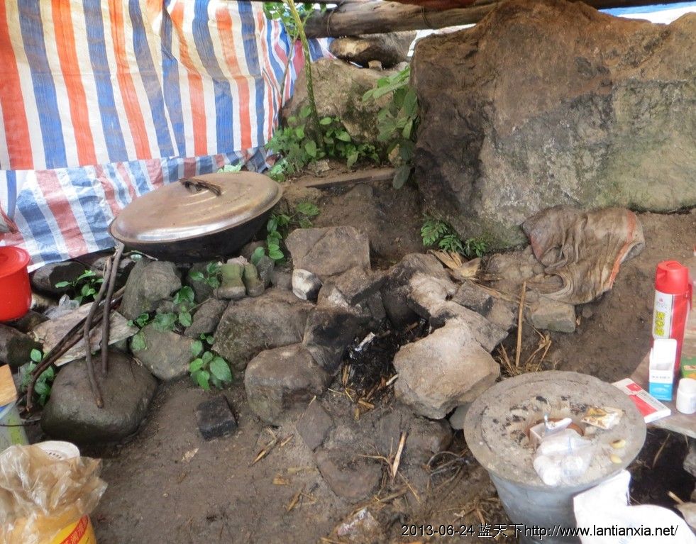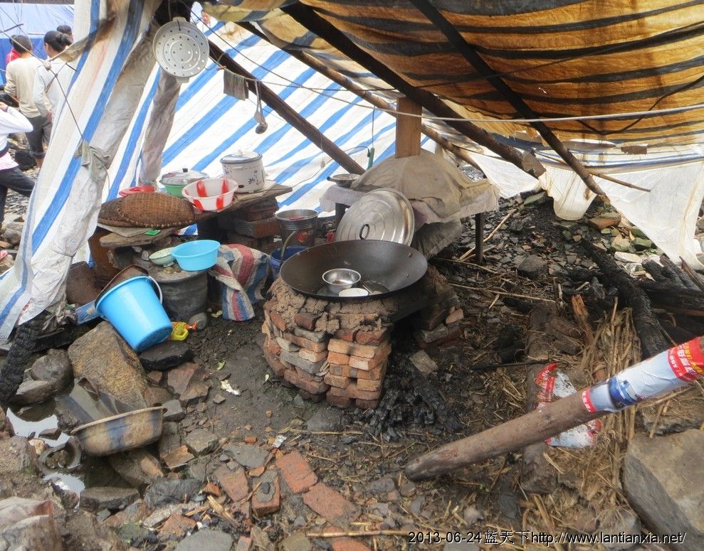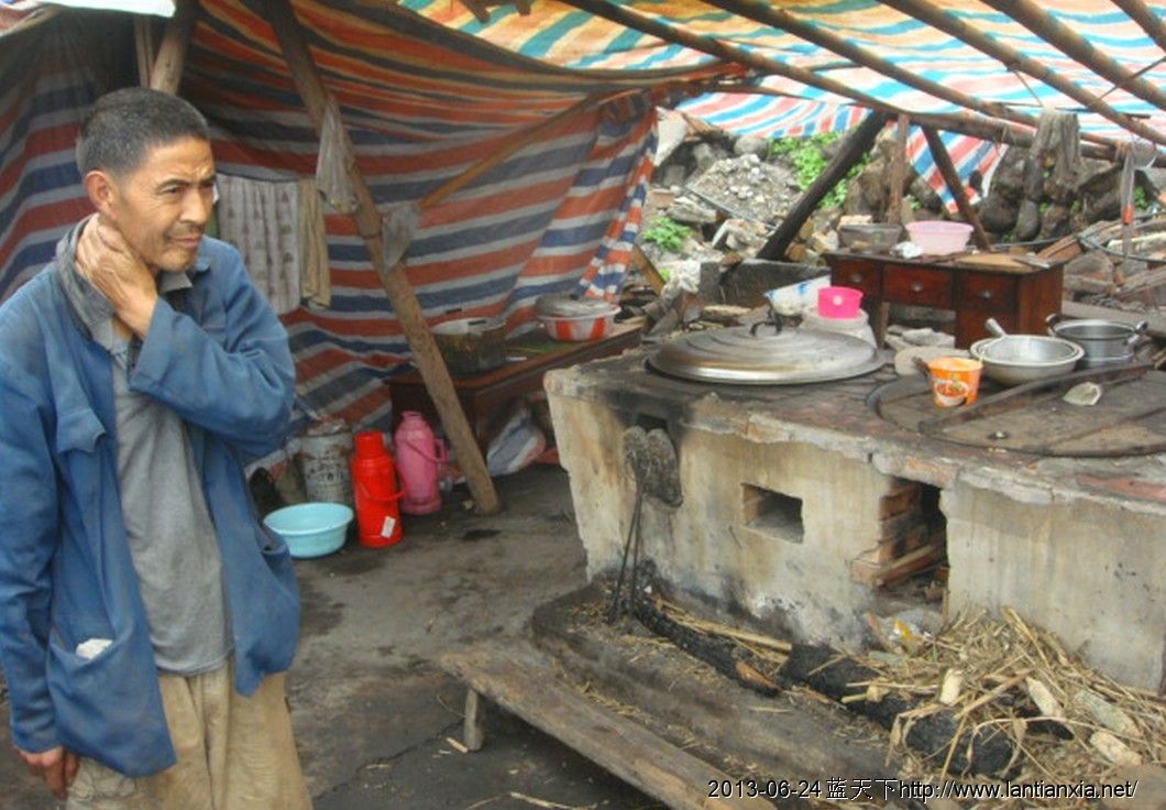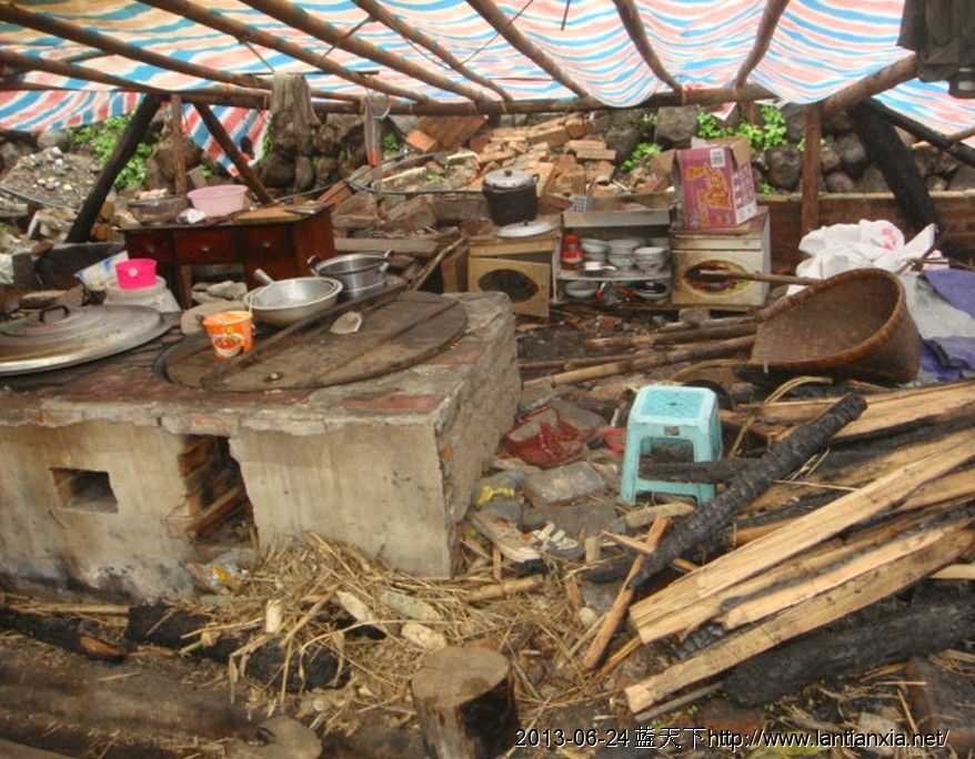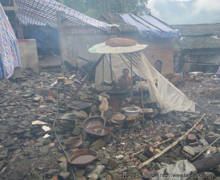 就在我们发放助学款的时候,出现了一个小插曲。一位教师为我们提供信息说,烟溪村六组有十八家住户一个150年历史的大院,在地震后的一周时间,突发火灾,房屋及家产全被烧毁。当我们到达那里走访时,出现在我们眼前的是一片焦枯与废墟,灾民们无一例外都住在帐篷里,而有的人家还在户外搭锅煮饭,下雨天则必须用塑料薄膜遮挡,而一些钢铁做的家具也被大火烧得面目全非。