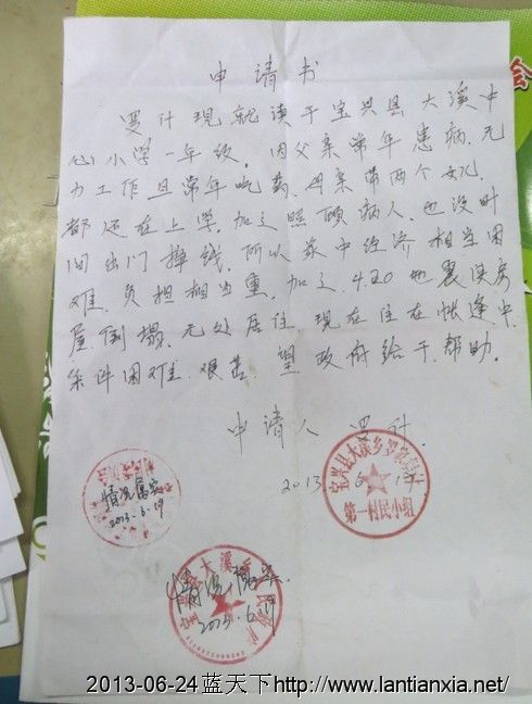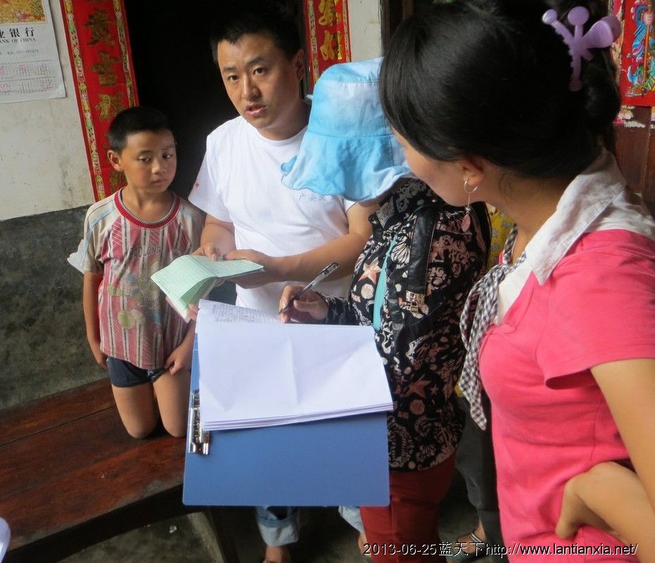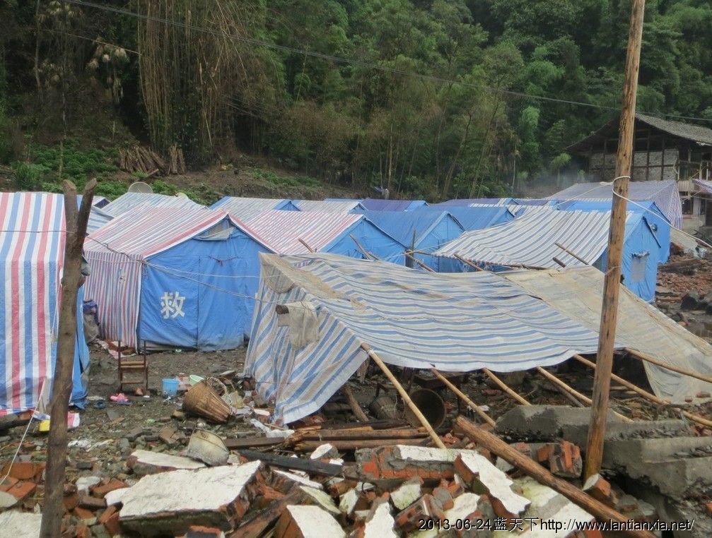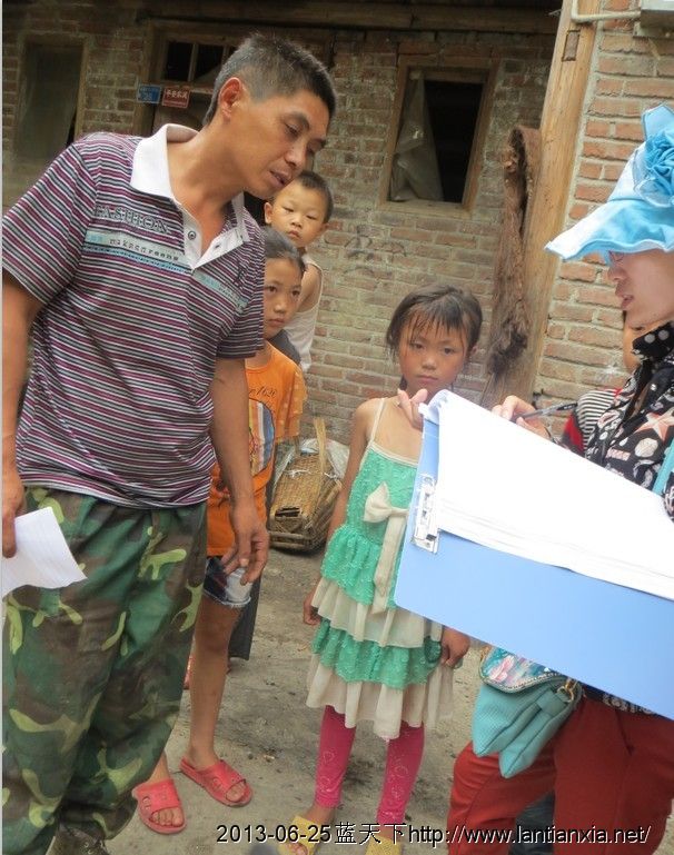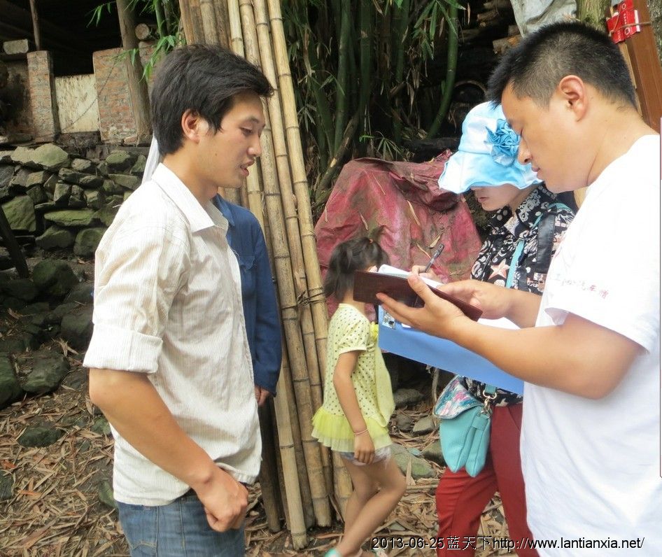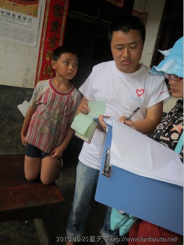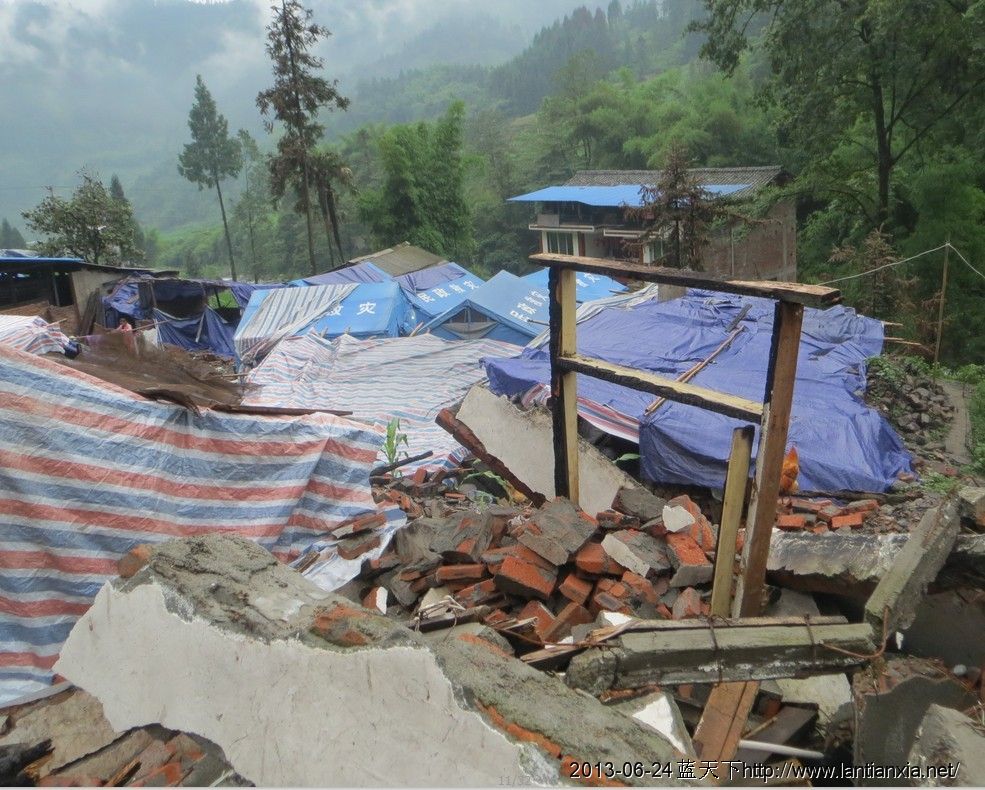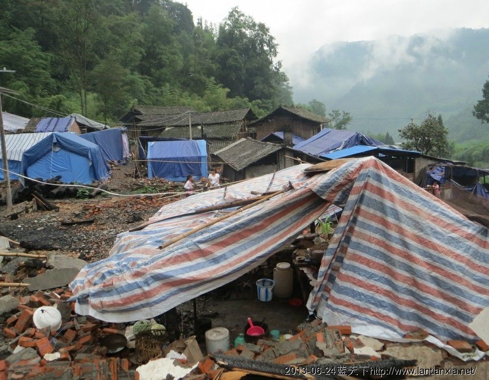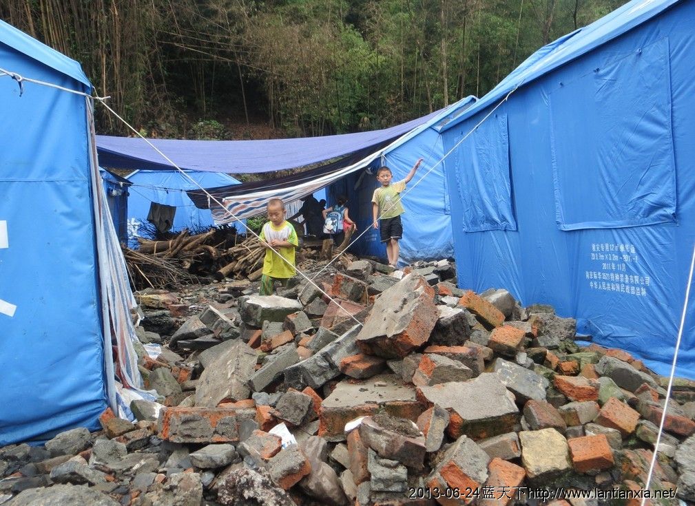 吃过午饭,我们分四个小组,分别穿行在崎岖蜿蜒的山路上,在烈日下,在废墟上,在田垄间,在倒塌的民房前,在蓝色的帐篷里,在两岸都是重岩叠嶂的峡谷间。我们认真的走访着,调查着,询问着,观察着。当我的脚真真切切的踏在废墟上的时候,我的心头有一种酸涩在涌动,黝黑的脸上,写满山区孩子的淳朴,也折射山区家庭生存的辛苦。这些家庭,或家徒四壁,或父母离异母亲远走,或老弱病残不堪重荷……而一路上还有诸多家庭受损的灾民,是我们的能力范围所不能顾及,只恨自己心有余而力不足啊!