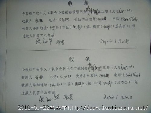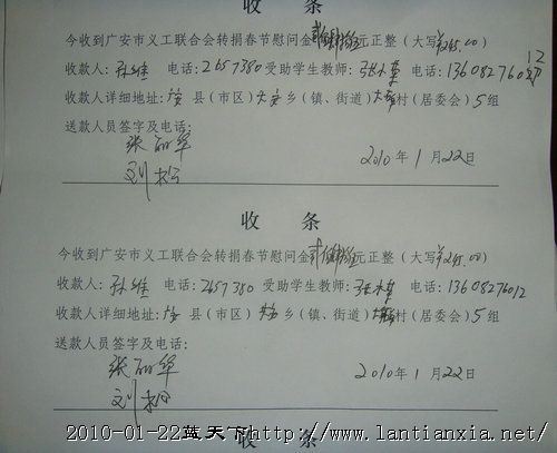 下午3点20分,广安区的义工飞舞、暗夜、七许快乐、阳光、刘松、逸多冒着严寒驱车来到大安一校,给李艳、谭盈枝、孙维、王亚西四名孩子送来了过年的慰问金,并关切地询问他们的生活和学习情况。奉献爱心,传递爱心,让孤儿不孤,过上一个欢乐年,孩子们真正感受了人间的温暖。