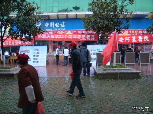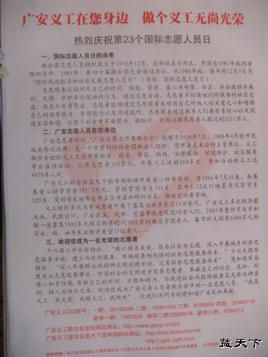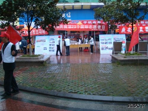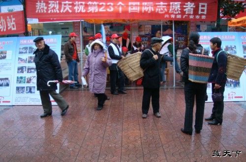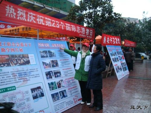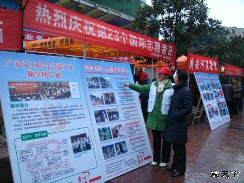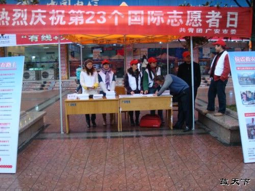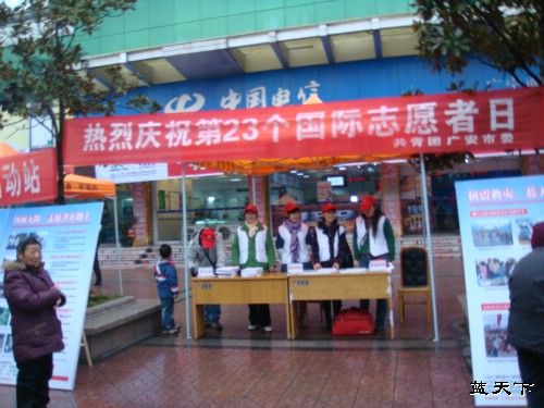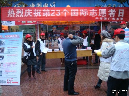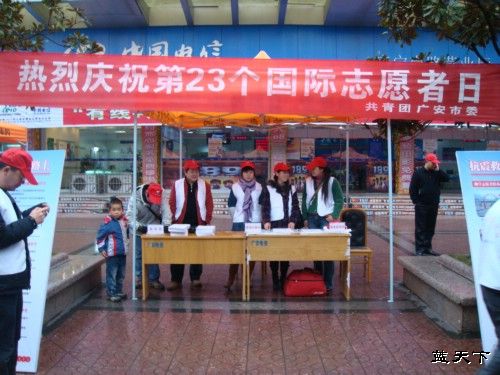 2008年12月5日是世界第23个国际自愿者日,广安市义务工作者联合会在市电信局门前开展自愿活动。活动内容:展板宣传、传单宣传、现场征集自愿者、助学宣传、禁毒、义诊、帮弱助残宣传、到市特殊学校送衣物等活动。活动时间:2008年12月5日上午9点---11:30结束。
