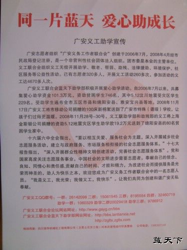 蓝天下相关联系方式:网站:www.lantianxia.net 蓝天下QQ群: 群一:1060329 群二:20029418 群三:9786912 群四:69848943 群五:83414209 资助群:58502949 大学生助学团:57387110 网站:www.lantianxia.net 〓物资募集〓:13193110 后勤宣传:58715682 助学娱乐群:56299408
