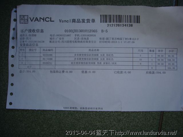 从凡客沟羽绒服6件594元,有发票。剩余856元。